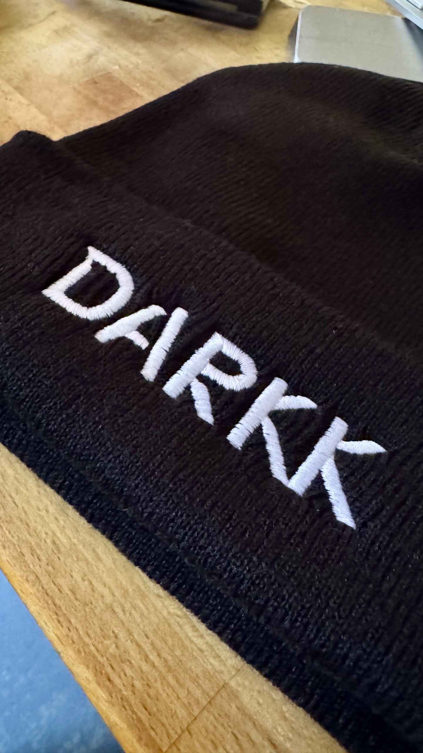 High quality black Beanie by Beechfield™ with a white embroidered DARKK logo. Super fluffy, keeps your ears warm and your image cool.