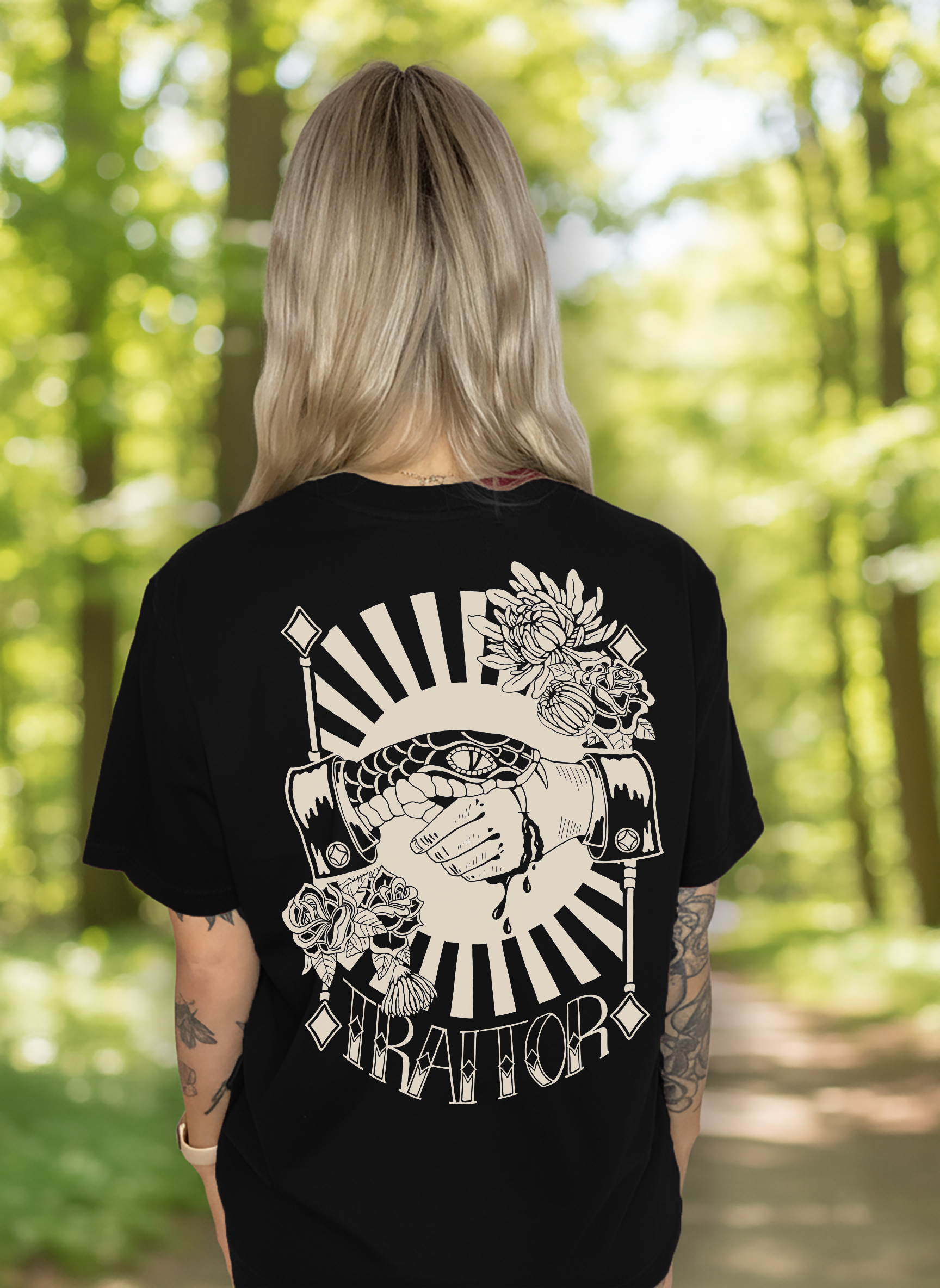 Hand-drawn tattoo design themed by our song Traitor. Front: a darkk flower, back: full-size back-print with our traitorous snake-bite! Both are printed in light beige.